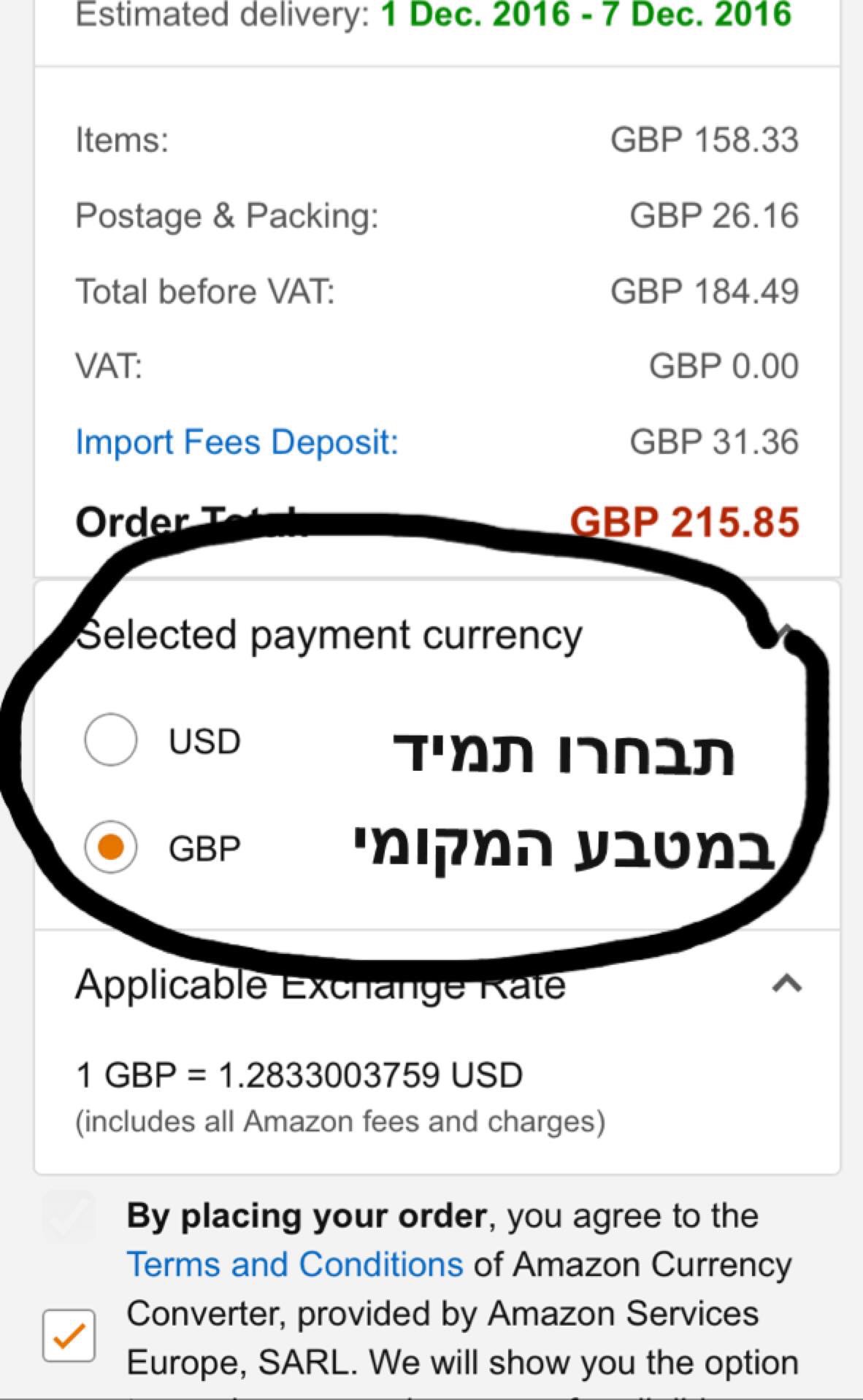 4. תשלום – תמיד תשלמו במטבע בו אתם מבצעים את הרכישה – באמזון אנגליה – בפאונד, באמזון גרמניה – יורו וכו. אל תשלמו בשקלים! אל תשלמו בדולר באמזון בריטניה וכו – עלות ההמרה של אמזון מטורפת וזה אחד ממרכיבי רווח מרכזיים שלהם – מדובר על כ 6% עמלת המרה. בכל חברת אשראי שלא תהיו אתם משלמים פחות ולרוב הרבה הרבה פחות (וכן, הגיע הזמן למי שלא עשה את זה להרים טלפון לחברת האשראי ולדרוש הנחה בתשלומים במטבעות זרים. חברות האשראי לא יעשו את זה מיוזמתן…)