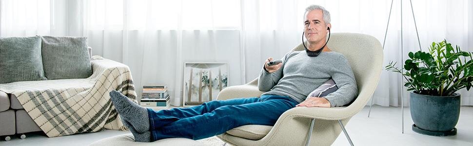 אוזניות טלוויזיה נטענות מהסוג שלא מפריע למשקפיים. מתאים במיוחד לאוכלוסיה הבוגרת – פחות מפעיל לחץ על הראש והאוזניים.