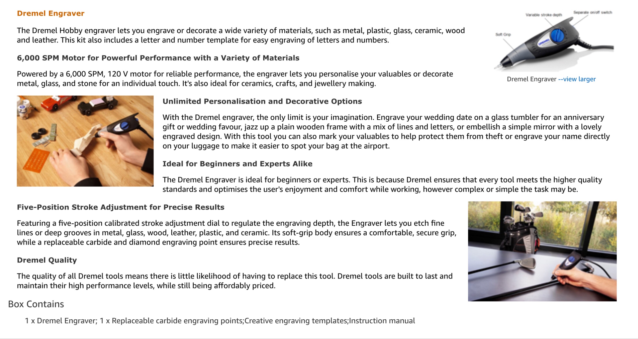 Customise your valuables with this Dremel Engraver! This Dremel engraver works on a wide range of materials, including glass,plastic, metal and leather, and has a soft grip for extra comfort and control