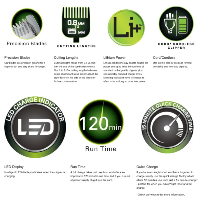 Lithium Ion technology boasts double the power and up to twice the run time of standard rechargeable clippers plus considerably reduced charge times. Meaning you won't have to charge as often or for as long so uses less power. This technology also has a longer life span than standard rechargeable batteries and virtually no loss of charge whilst not in use which ensures that it will always be charged and ready to go when you need it.