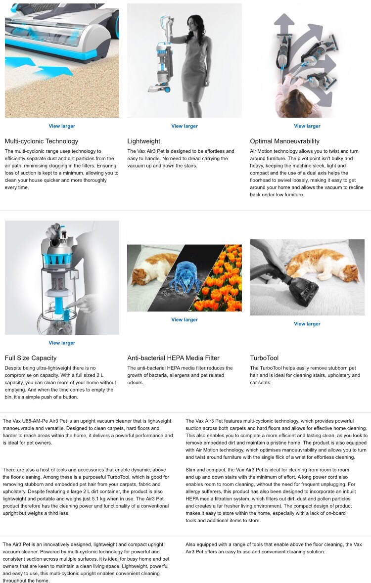 Complete all of your cleaning tasks with ease thanks to the Air3 Upright Ultra Lightweight Vacuum Cleaner from Vax. Perfect for homes with pets, the dual axis and air motion technology create an in-depth clean across carpets and hard floors whilst eliminating pet odours, so you can keep your home feeling fresh all year round. Boasting advanced multi-cyclonic technology, this vacuum cleaner also boasts a high suction power. Its generous 2 litre bagless dust capacity and lightweight design ensures that this vacuum cleaner is perfect for all sized homes whilst also enabling easy movability from room to room. Additional accessories include one turbo tool, upholstery tool and a 2-in-1 tool, so you can now achieve a specific clean to suit any task.
