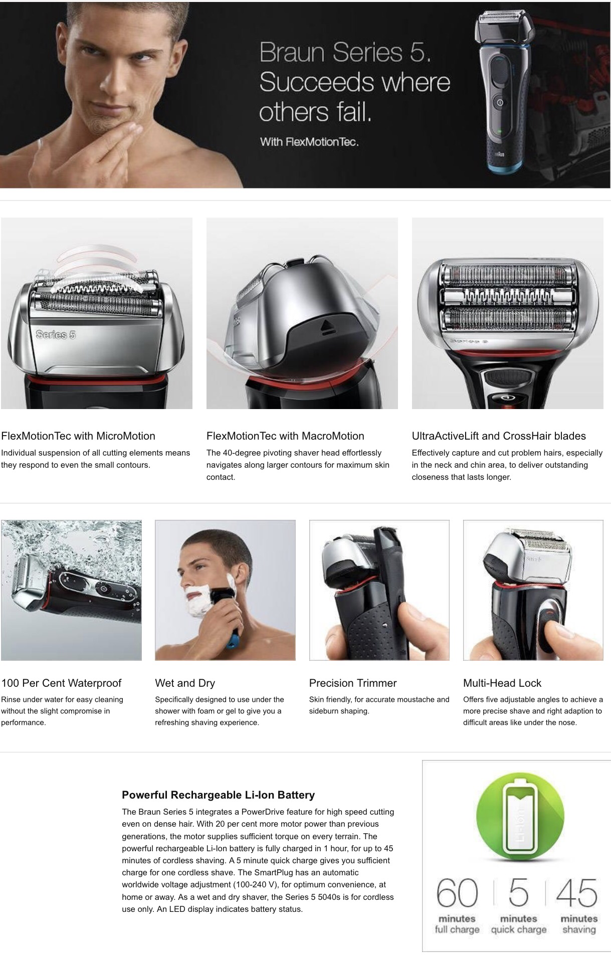 - Series 5 shavers with cross hair blades to cut closer to skin for a longer lasting shave