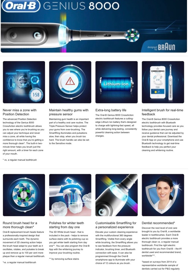 מוגדרת כמברשת שיניים המתקדמת ביותר על פני כדור הארץ (כמעט… יש את דגם 9000 כמובן – שזו אותה מברשת בדיוק רק איבזור שונה וכו). יודעת איפה בדיוק אתם מצחצחים בטכנולוגיה זיהוי מיקום ומנחה אתכם איפה לנקות…כולל מנגנון כיוונון מהירות אוטמטית לשמירה על החניכיים ועוד ועוד ועוד…
