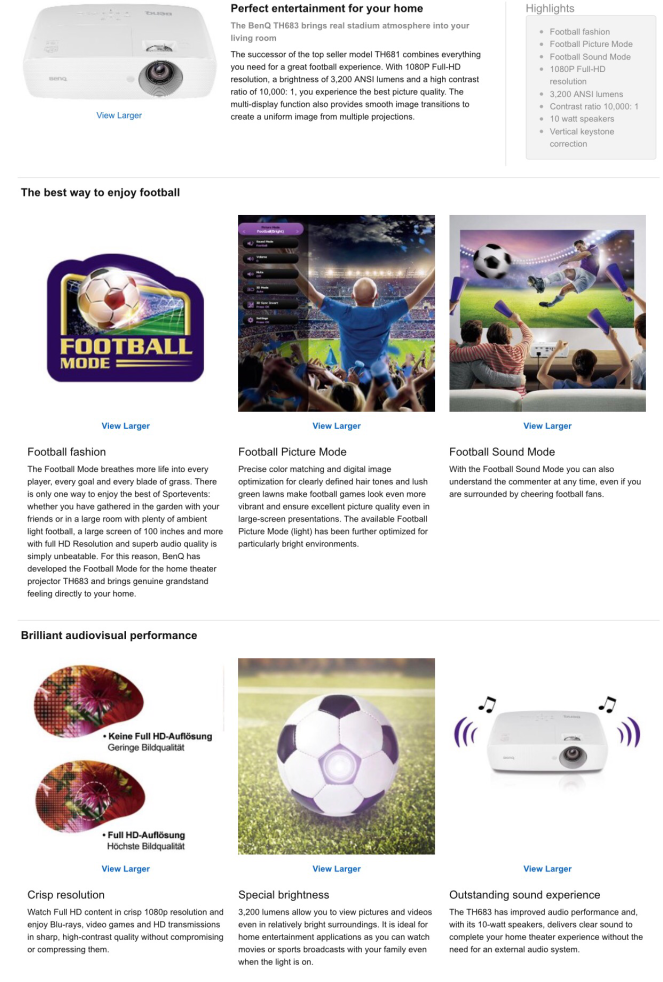 - Resolution Full-HD 1920 x 1080 / 3.200 Ansi Lumen / Contrast 10,000: 1 / Football Mode
