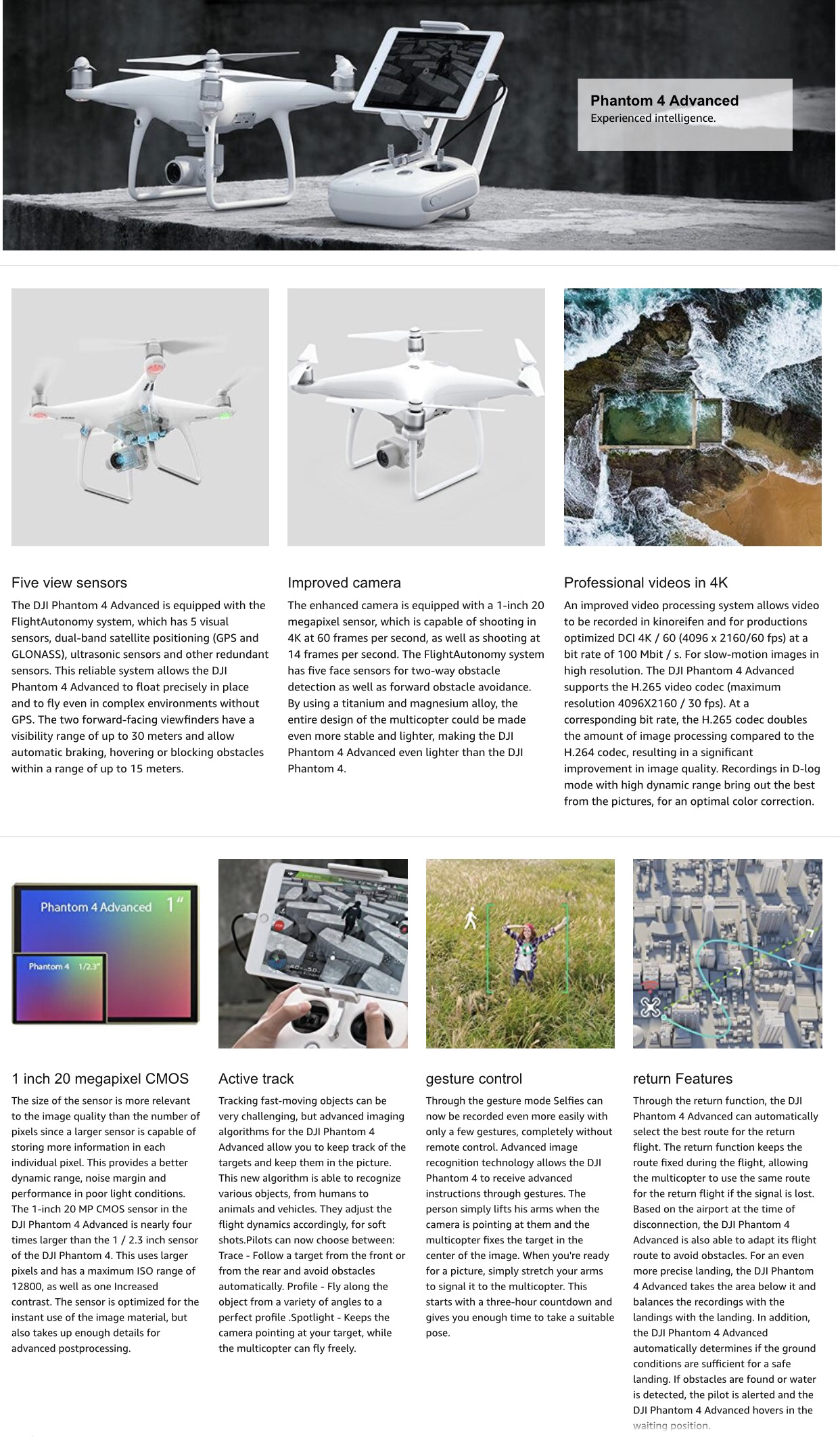 - Scope of delivery: Phantom 4 Advanced; Remote Control; 8 propellers; Battery pack; Charger; Power cord; Gimbal clamp; USB OTG cable; Micro-USB cable; Micro SD card (16GB); carry bag