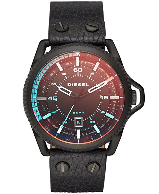 - DIESEL men watch – Black round stainless steel case (diam. 50 mm) in polished and brushed finishing – 5 ATM water pressure resistance – Black crowned stainless steel bezel