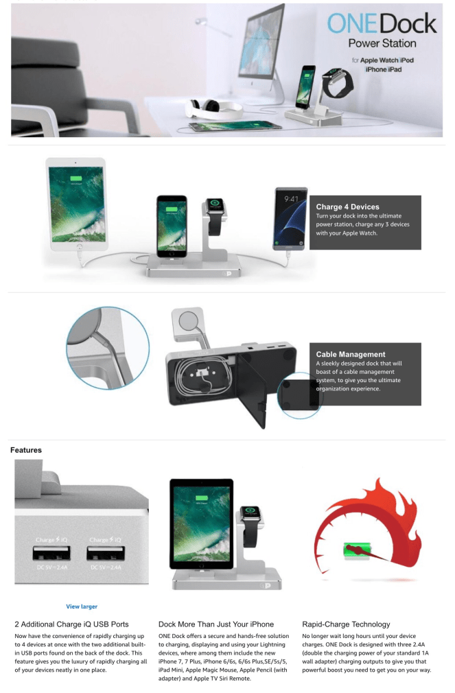 - CHARGE 4 DEVICES AT ONCE – Two Built-in USB Ports [2.4A each] allows you to charge your iPhone & Apple Watch along with any Two Additional Devices Powerfully at Once. Built-in Rapid-Charge Lightning Connector charges your device TWICE as FAST as your traditional 1a USB wall adapter. CHARGE FAST & CLEAN – UL Listed Power Adapter gives your dock the Boost it needs to charge 4 devices Powerfully & Clean, without any damage to your wall sockets. Provides 8.2A Total Power Output.