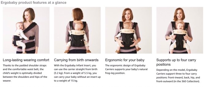 The Ergobaby Four Position 360 Carrier offers four safe, ergonomic positions: front, back, hip and forward