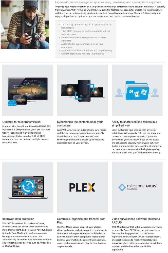 Organize your media collection on a single site with this high-performance NAS solution and access it securely from anywhere. With My Cloud EX2 Ultra, you get ultra-fast transfer speeds for smooth HD transmission. In addition, you can automatically synchronize content from all computers, share files and folders easily and enjoy multiple backup options so you can create your own custom system with ease.