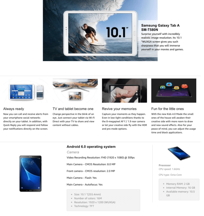 Samsung Galaxy Tab A – Tablet (10.1 "- 255.4 mm, 16GB eMMC, Android 6.0)