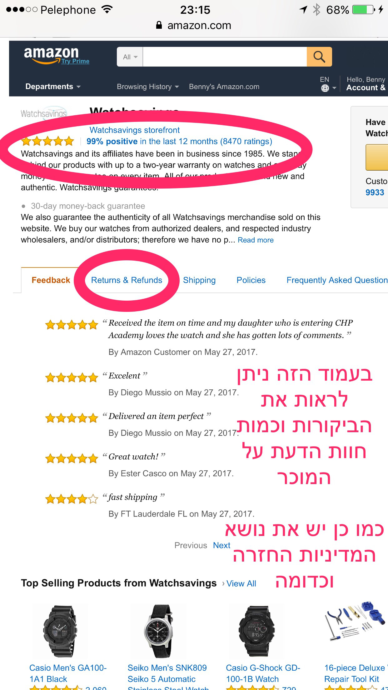 3. מדיניות המוכר בכל נושא של החזרות וכדומה – בעמוד המוכר תוכלו לראות ״מי נגד מי״ וכמה כמה – חשוב להציץ שם לגבי מדיניות ההחזרה או כל דבר אחר שחשוב לכם.