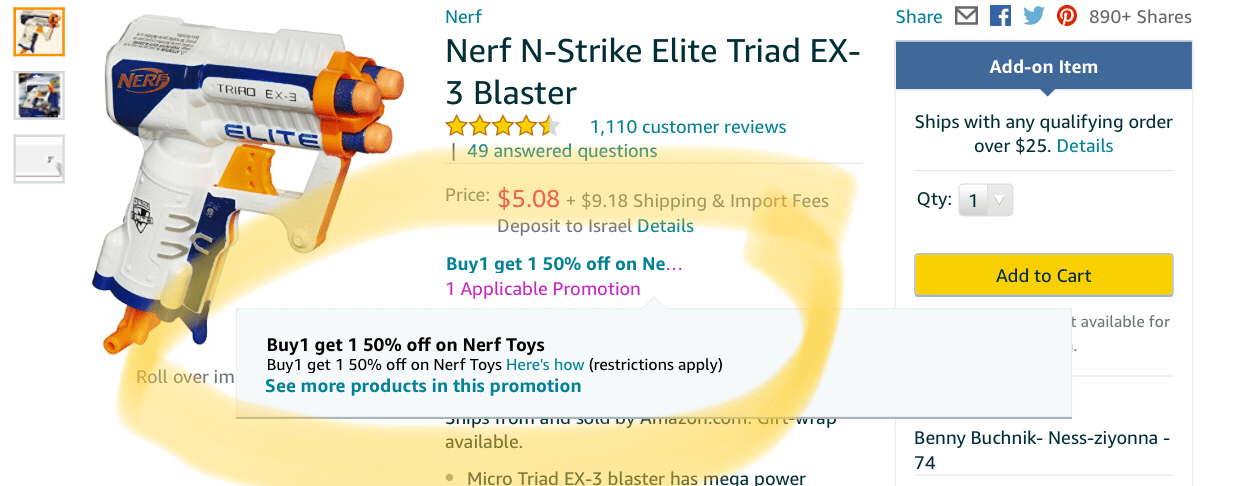 יש לבחור מוצרים שאמזון הוא המוכר. המוצרים שמשתתפים במבצע מסומנים מתחת למחיר – ראו דוגמא