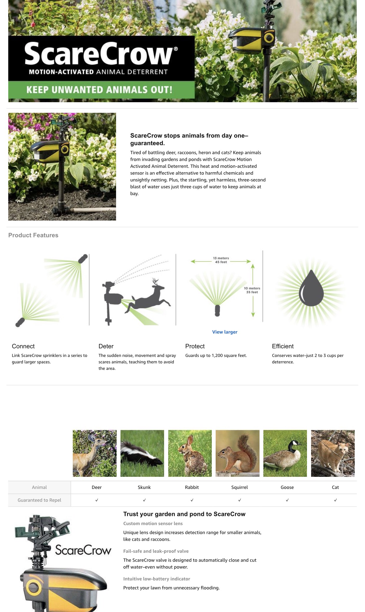 - Startling‐but‐harmless burst of water keeps unwanted animals out of gardens, yards, and ponds