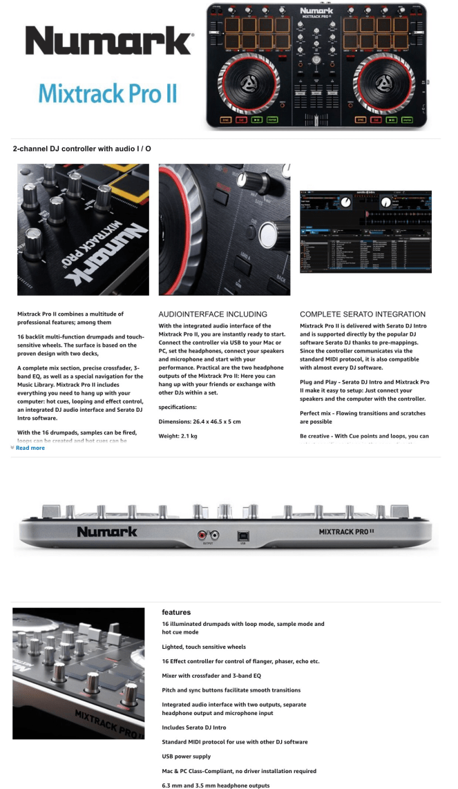 From Numark, the world’s leading creator of DJ technology, comes Mixtrack Pro II—now with a streamlined design and an expanded layout of professional controls, including 16 backlit multifunction drum pads and illuminated touch-activated platters. With Mixtrack Pro II, you get everything you need to DJ with your computer: hot cues, looping, and effects controls, a built-in professional DJ audio interface, plus Serato DJ Intro software.