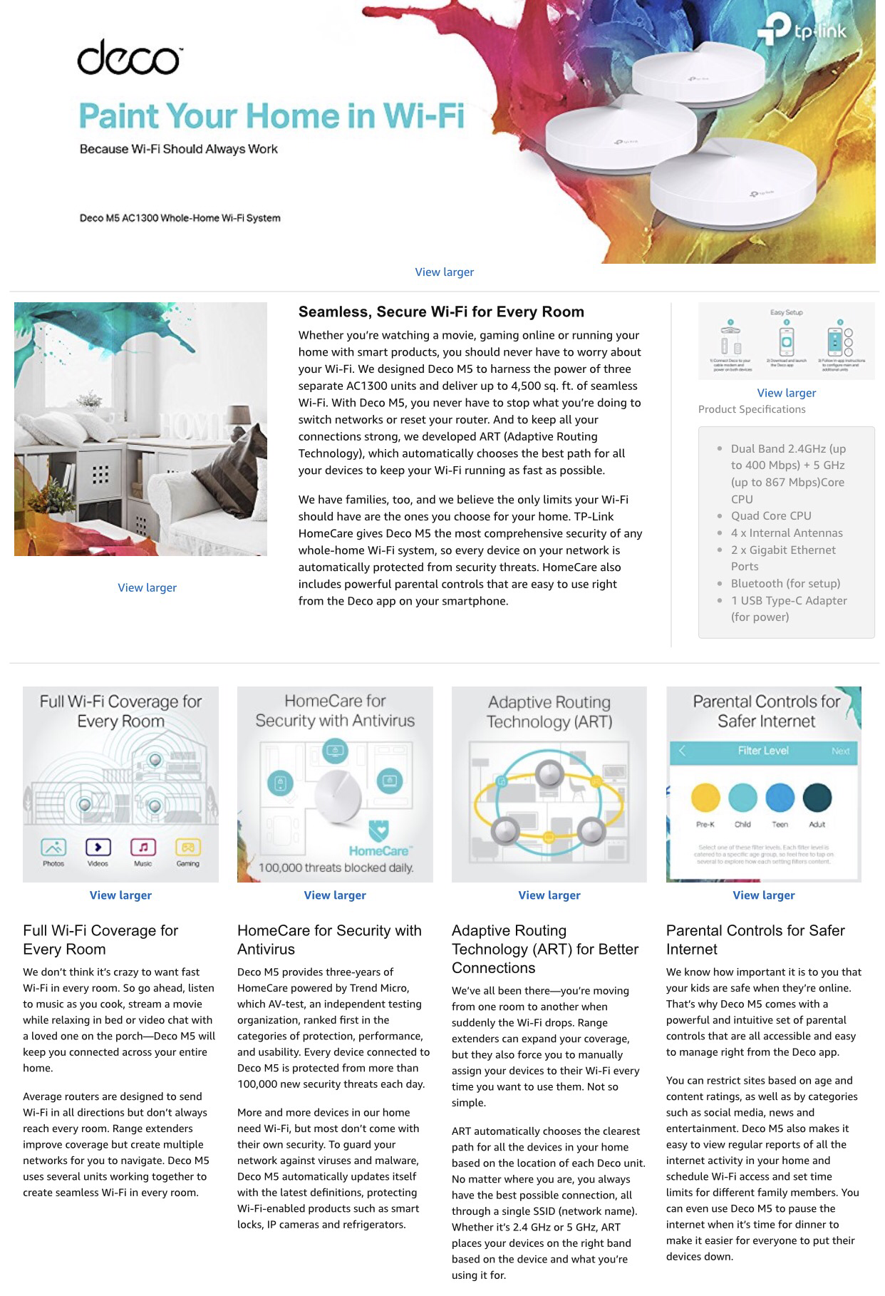 - Through TP-Link HomeCare, every device connected to Deco M5 is protected from more than 100,000 newsecurity threats each day. The Deco M5 is the most comprehensive security in a whole-home Wi-Fi system