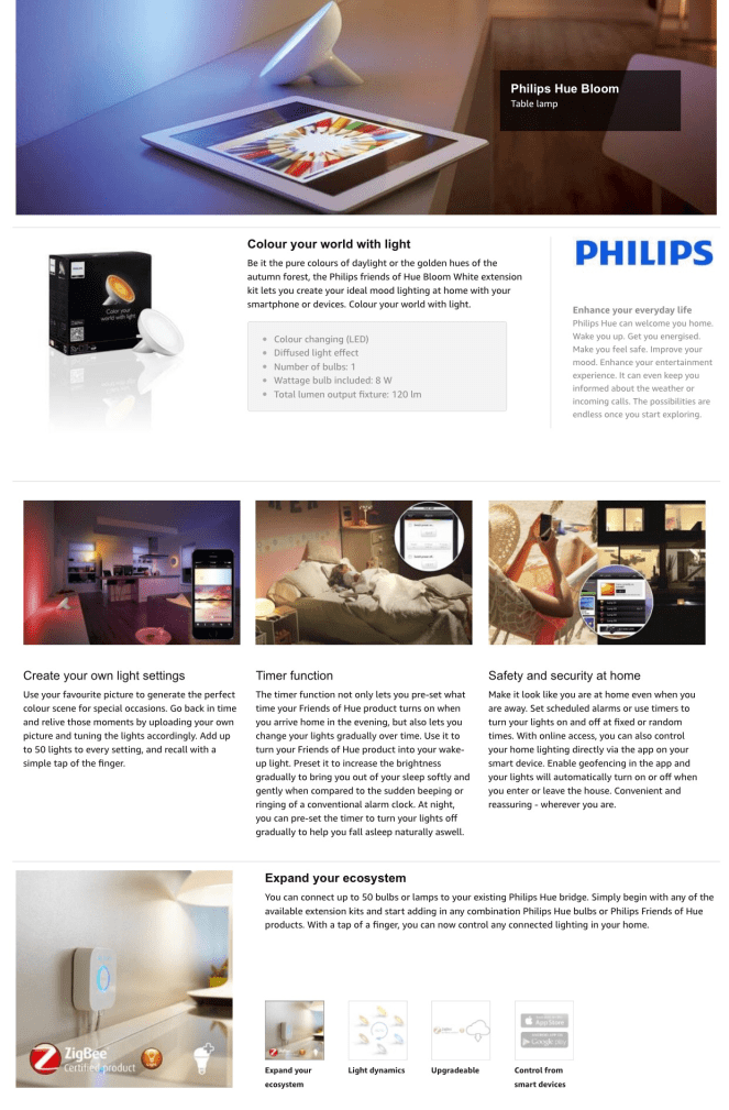 - Create and control lighting schemes via the Philips Hue app on Apple or Android devices – Hue bridge needed ( sold separately)