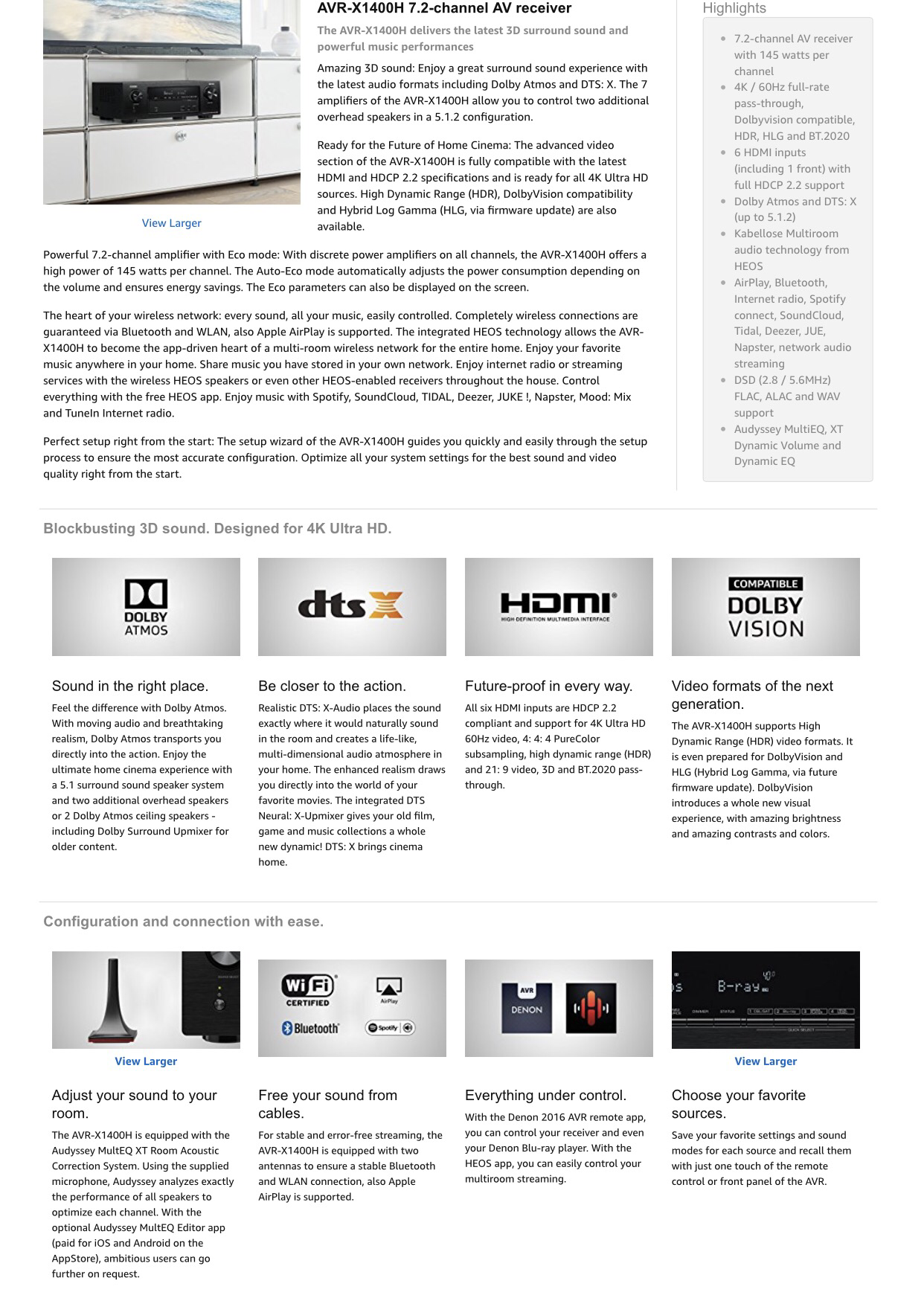 Amazing 3D sound: Enjoy great surround sound experiences with the latest audio formats including Dolby Atmos and DTS: X. The seven amplifiers of the AVR-X2400H allow you to control two additional overhead speakers in a 5.1.2 configuration. Ready for the Future of Home Cinema: The advanced video section of the AVR-X2400H is fully compatible with the latest HDMI and HDCP 2.2 specifications and is ready for all 4K Ultra HD sources. High Dynamic Range (HDR), DolbyVision compatibility and Hybrid Log Gamma (HLG, via firmware update) are also available.