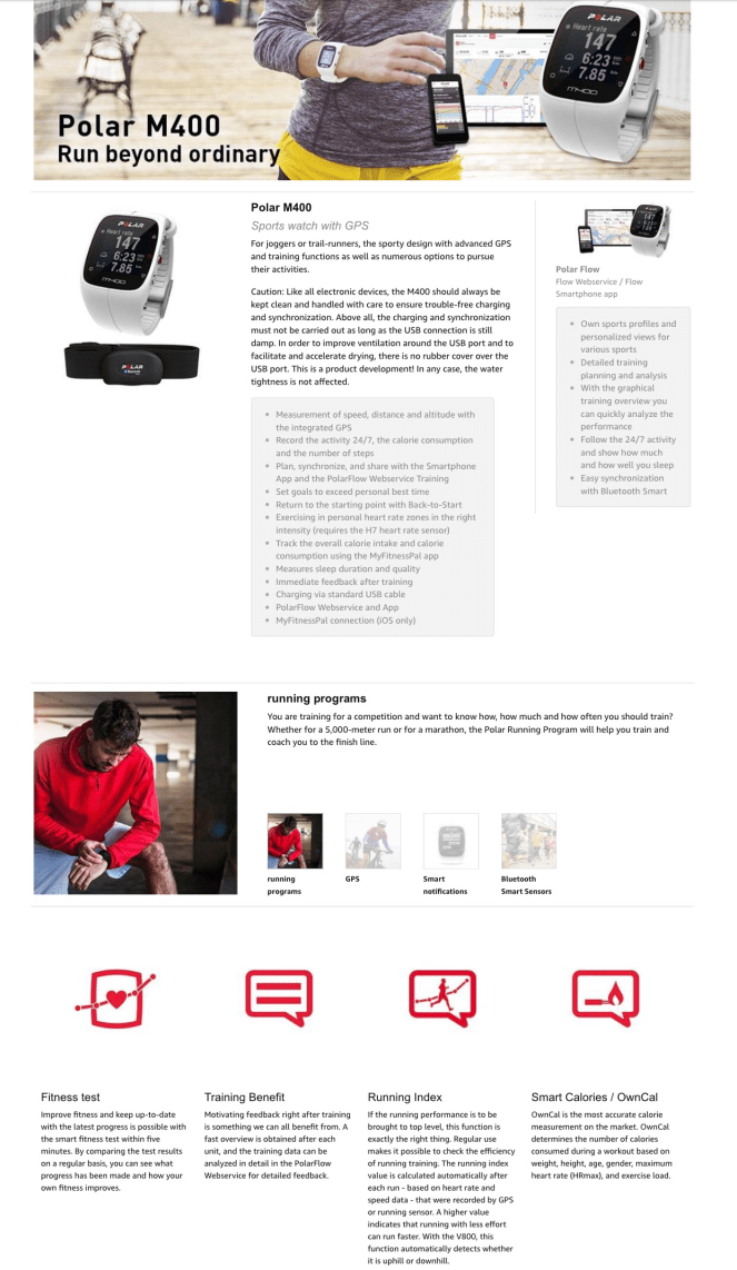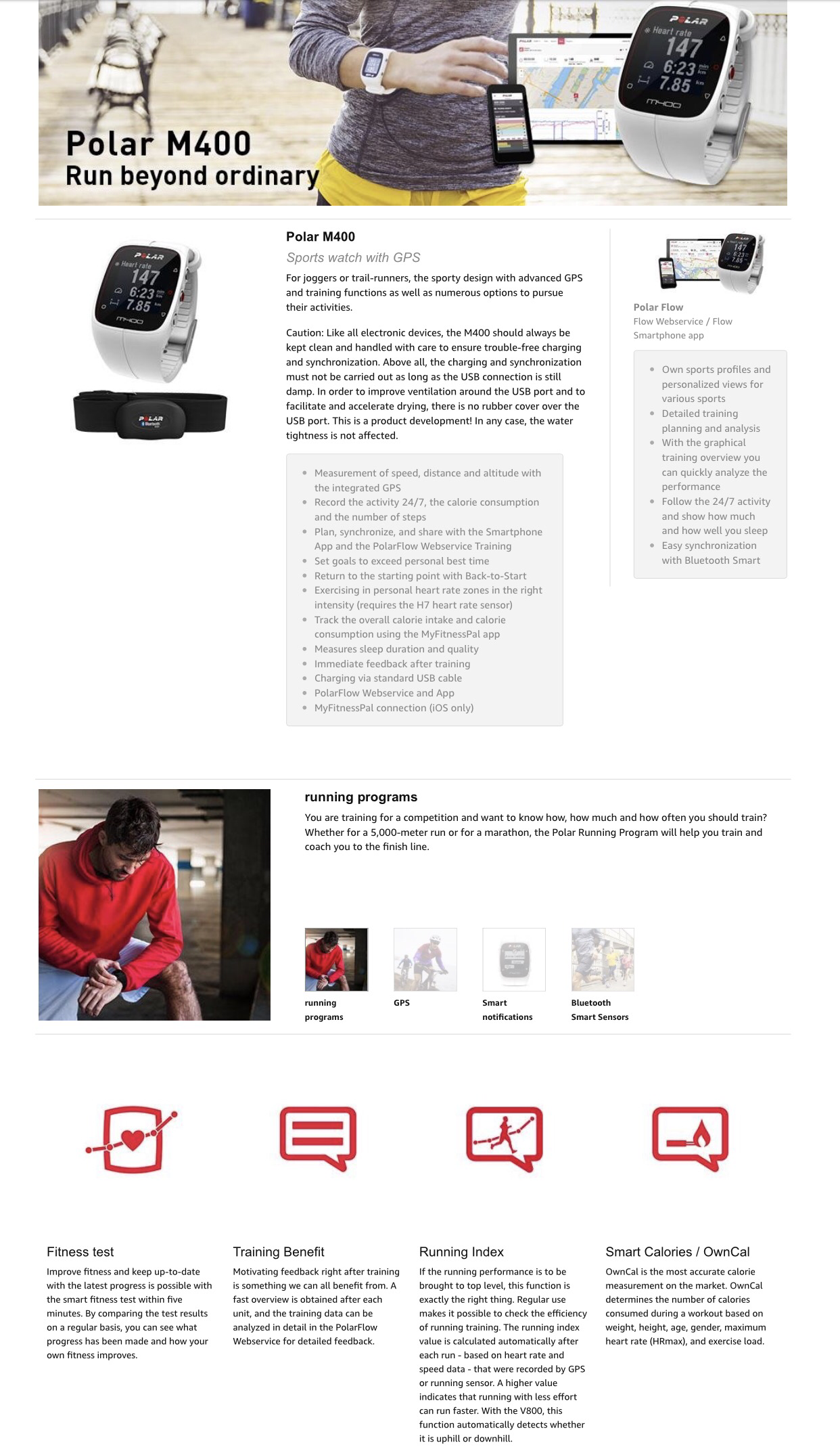 Track pace, distance and altitude with the built-in GPS. Find your way back home with Back to Start.^Follow your 24/7 activity, calories and steps. Daily activity at different intensity levels (low, medium, high)^Plan, sync and share your training with Polar Flow mobile app and web service^Set targets to beat your personal best^Train at the right intensity within your personal heart rate zones