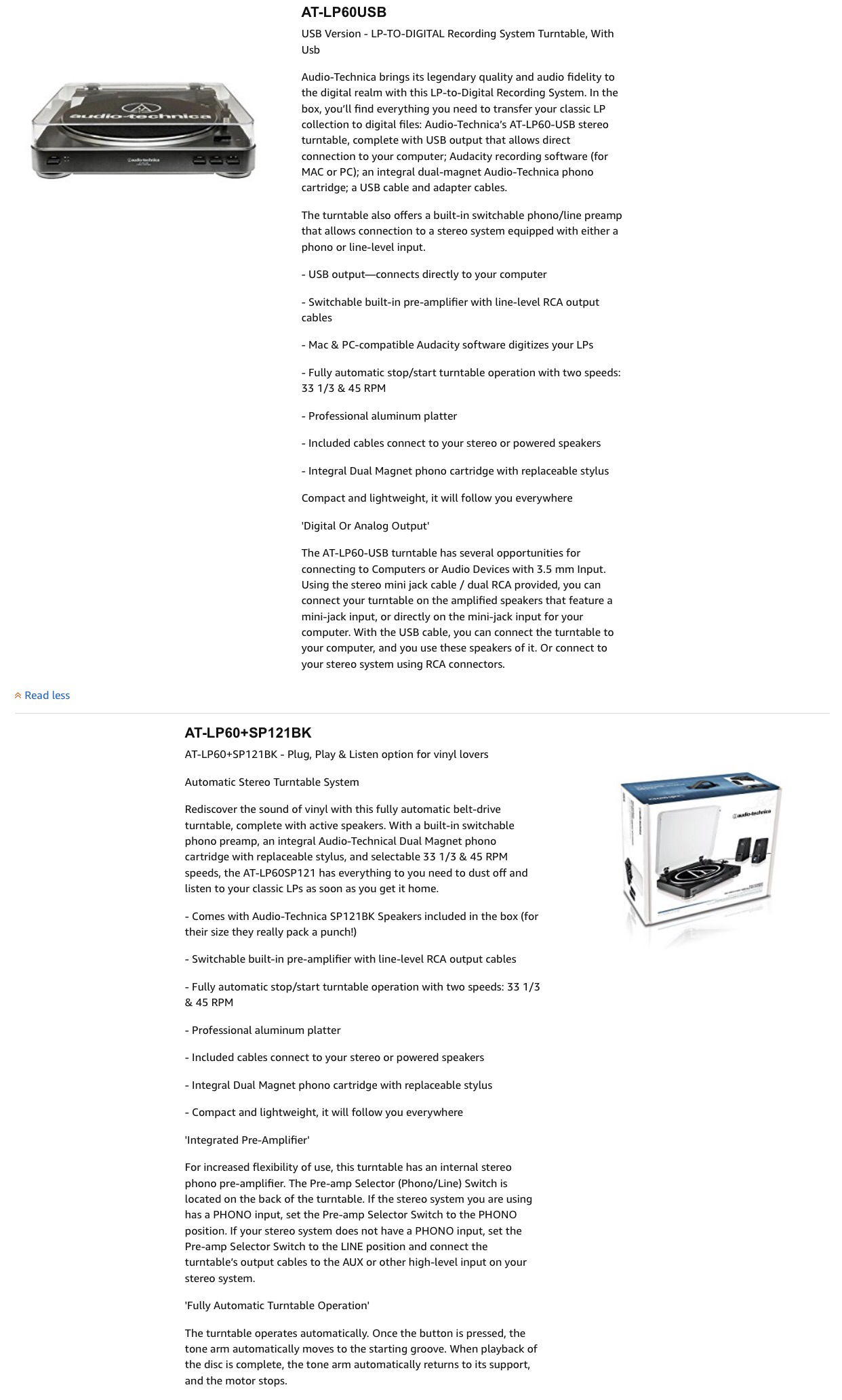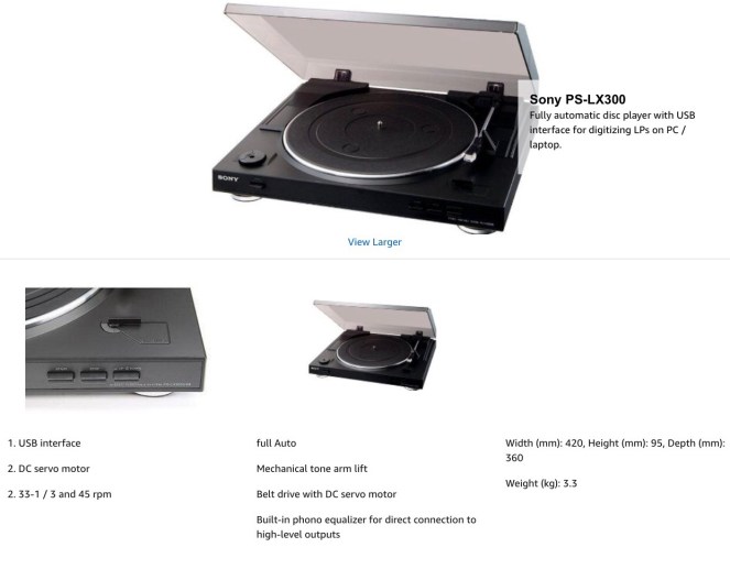 פטיפון אחד של אודיו טכניקה דגם – AT-LP60 והשני מבית Sony דגם PSLX300USB – שימו לב לא להתפתות לדגמים הללו מארהב כי המתח שונה וסתם תסתבכו.