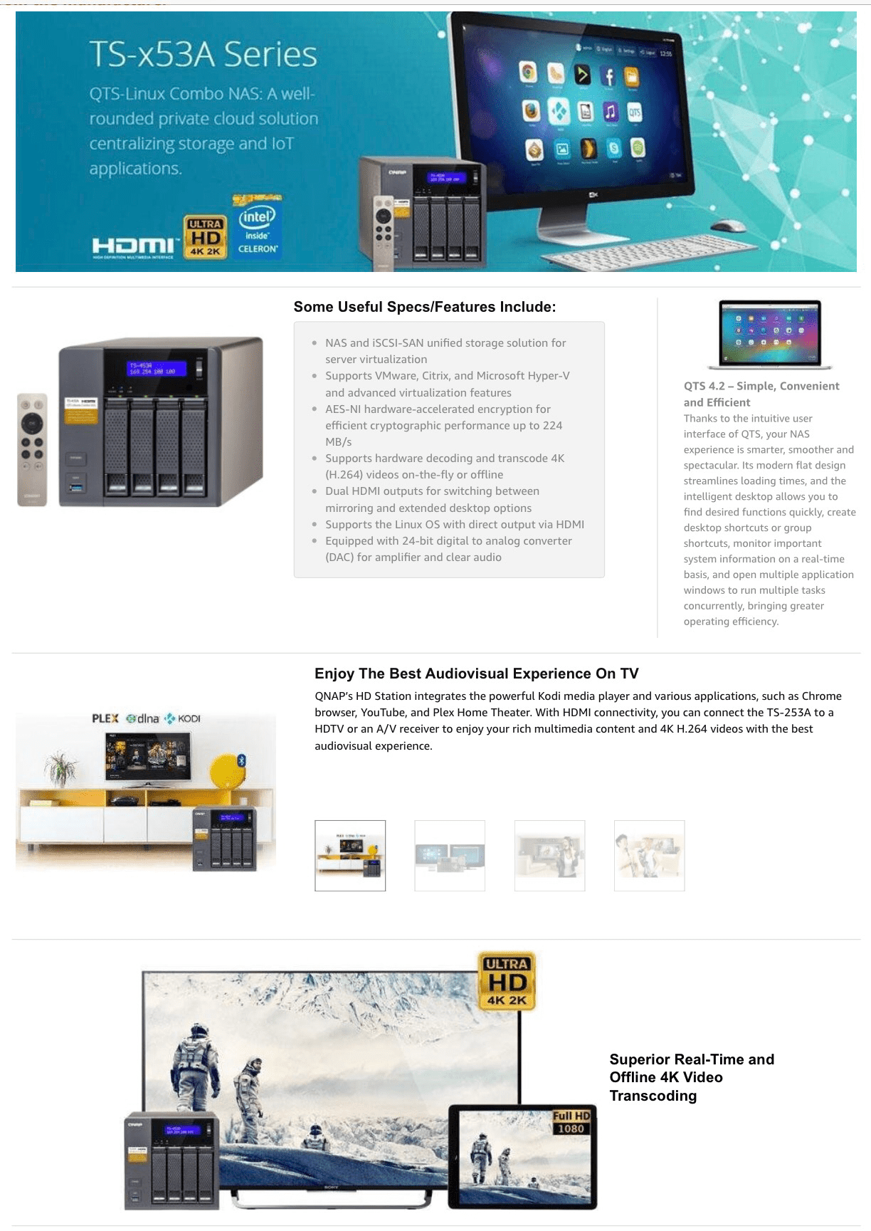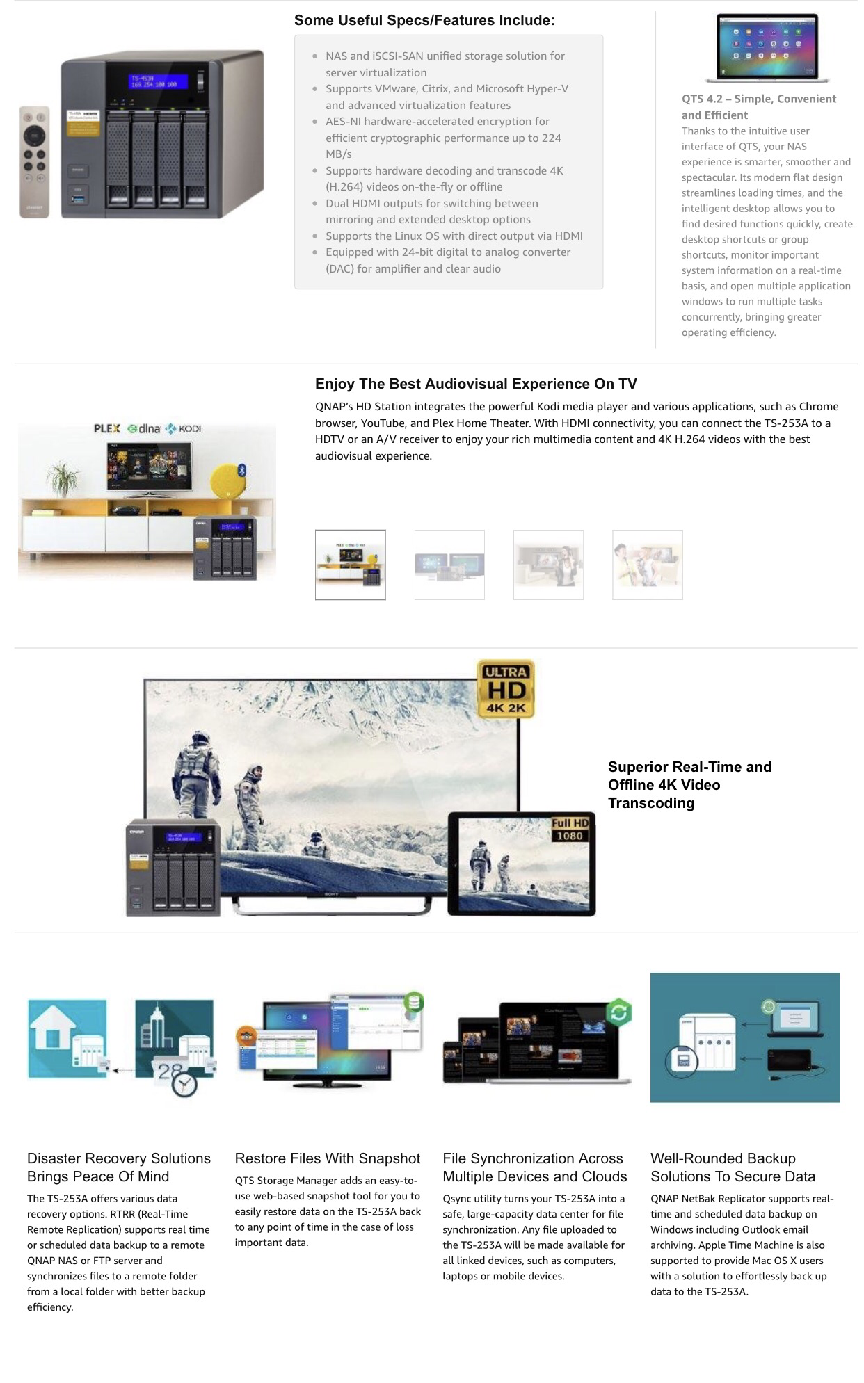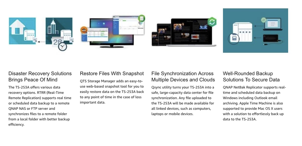 The TS-253A NAS server is designed to grow alongside with small and medium businesses, allowing its users to use the NAS as a storage device, but also a multitasking and multifunctional light-weight server. Not only is the TS-253A reliable, it is also packed with business-critical features such as LUN/ Volume Snapshot – allowing files/folders to revert to a previous state in case of any corruption, or file-loss. The TS-253A is powered by the latest Quad-core Intel Celeron N3150 CPU which allow users enjoy 4K (H.264) video playback and 1080P/4K video real-time transcoding right from the NAS to an HD/4K display.