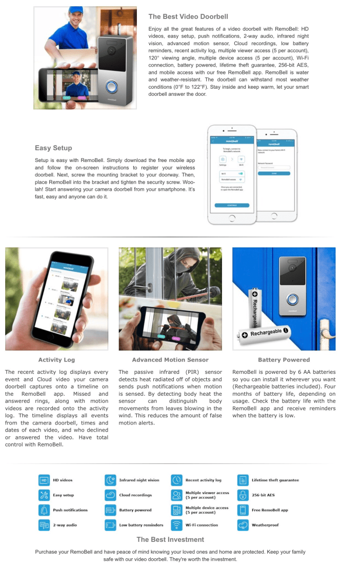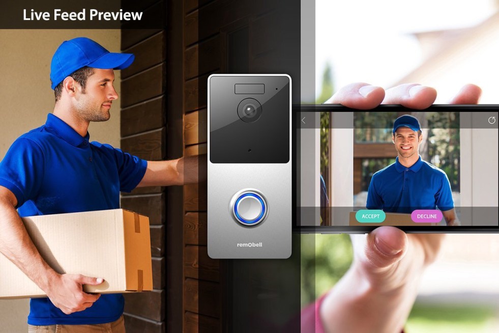 - A Wi-Fi, wireless, battery-powered, video doorbell that allows you to greet your guest from a phone