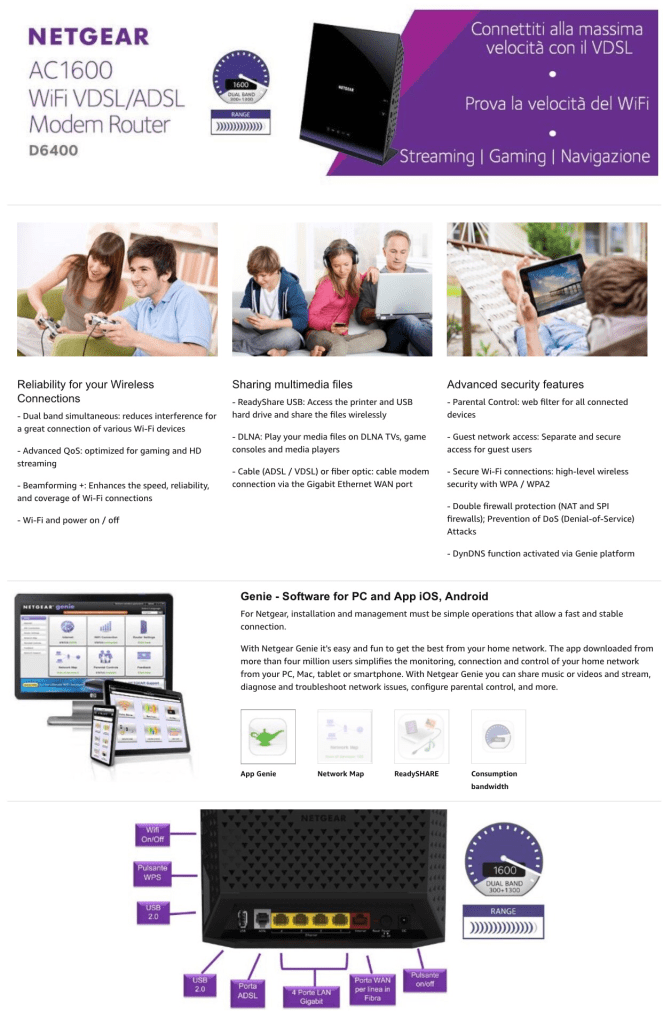 ה-D6400 כולל 4 יציאות LAN הפועלות במהירות 1G, תמיכה אלחוטית בתקן AC1600 ושתי כניסות בתקן USB 2.0. כמודם VDSL, ה-D6400 פועל בתאימות מלאה לרשת בזק והוא גם כולל תמיכה ב-Vectoring. במקביל לתמיכה ברשת בזק, כולל ה-D6400 כניסת WAN יעודית המאפשרת להשתמש בו כנתב אוניברסלי המתחבר לכל מודם אחר ובכלל זה ה-HOTBOX של חברת HOT.