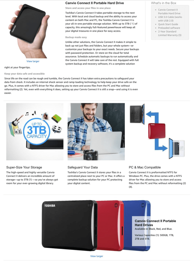 - Easy to set up and use with a simple and intuitive user interface. USB 3.0 powered. Store and access files from PC and Mac without reformatting. Includes Toshiba 2-Year Limited Warranty.