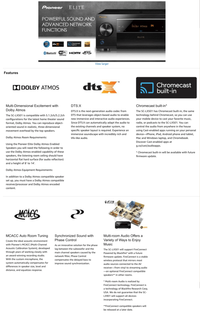 7.2 Channels each with 270 watt, Dolby Atmos, DTS x ready, DSD direct playback via network/USB to HDMI with Audio Return Channel, 384 kHz/32 bit DAC, automatic acoustic room calibration with MCACC