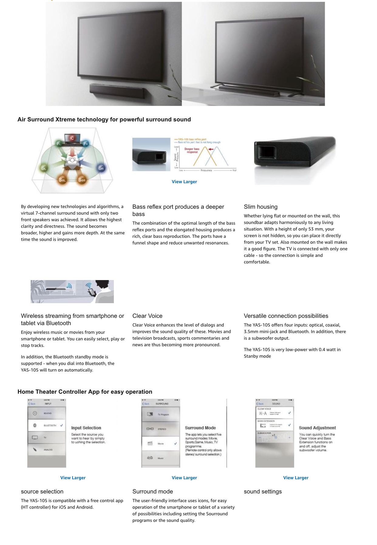 מקרן קול עם טכנולוגיות AIR SURROND XTRME הבלעדית לחברת Yamaha הנותנת תחושה של 7.1 ערוצים באיכות גבוהה. מערכת משולבת ברמקולים קדמיים כפולים וסאב מובנה כפול. צליל היקפי רב עוצמה AIR SURROUND XTREME . אפליקציית שליטה והזרמת תכנים (HT Controller).