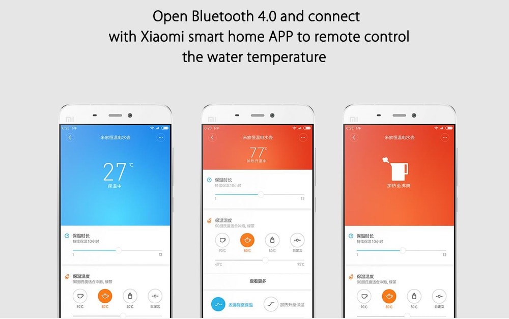 Original Xiaomi Mi Electric Kettle is a smart water heater. With 1.5L large capability and 12hrs temperature control time and automatically switches off once water comes to a boil. The water temperature can be remote controlled via your Xiaomi smart home APP, everything in on your hand!