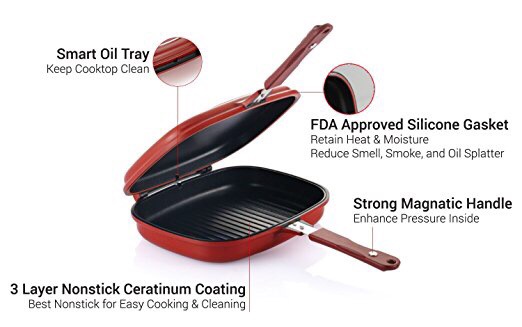 - SPLATTER FREE & EFFICIENT COOKING – Flip and cook on either side, upper or lower pans. / Make flipping food easy while retaining heat and moisture for quick, juicy, and tender food.