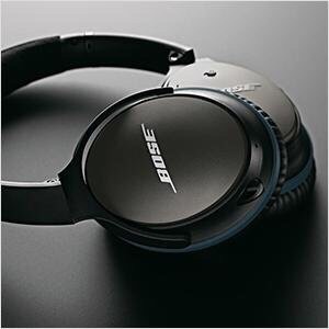 The iOS-compatible, black-colored version of the Bose QuietComfort 25 Acoustic Noise Cancelling Headphones build upon the company's reputation for active noise cancellation technology with a re-engineered sound signature, a more lightweight ergonomic design with adjustable headband, and circum-aural rotating earcups with suede-like padding that fold in for better portability using the included carry case.