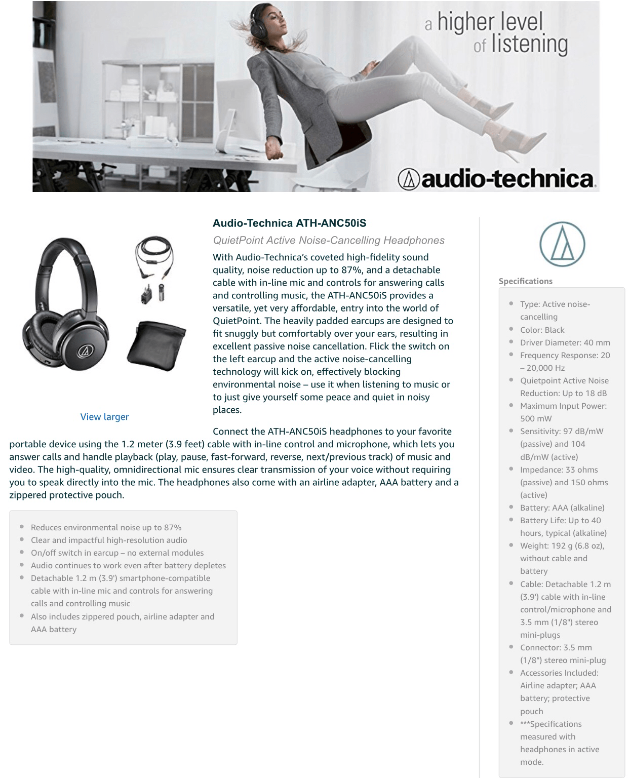 Audio-Technica ATH-ANC50iS QuietPoint Active Noise-Cancelling Headphones