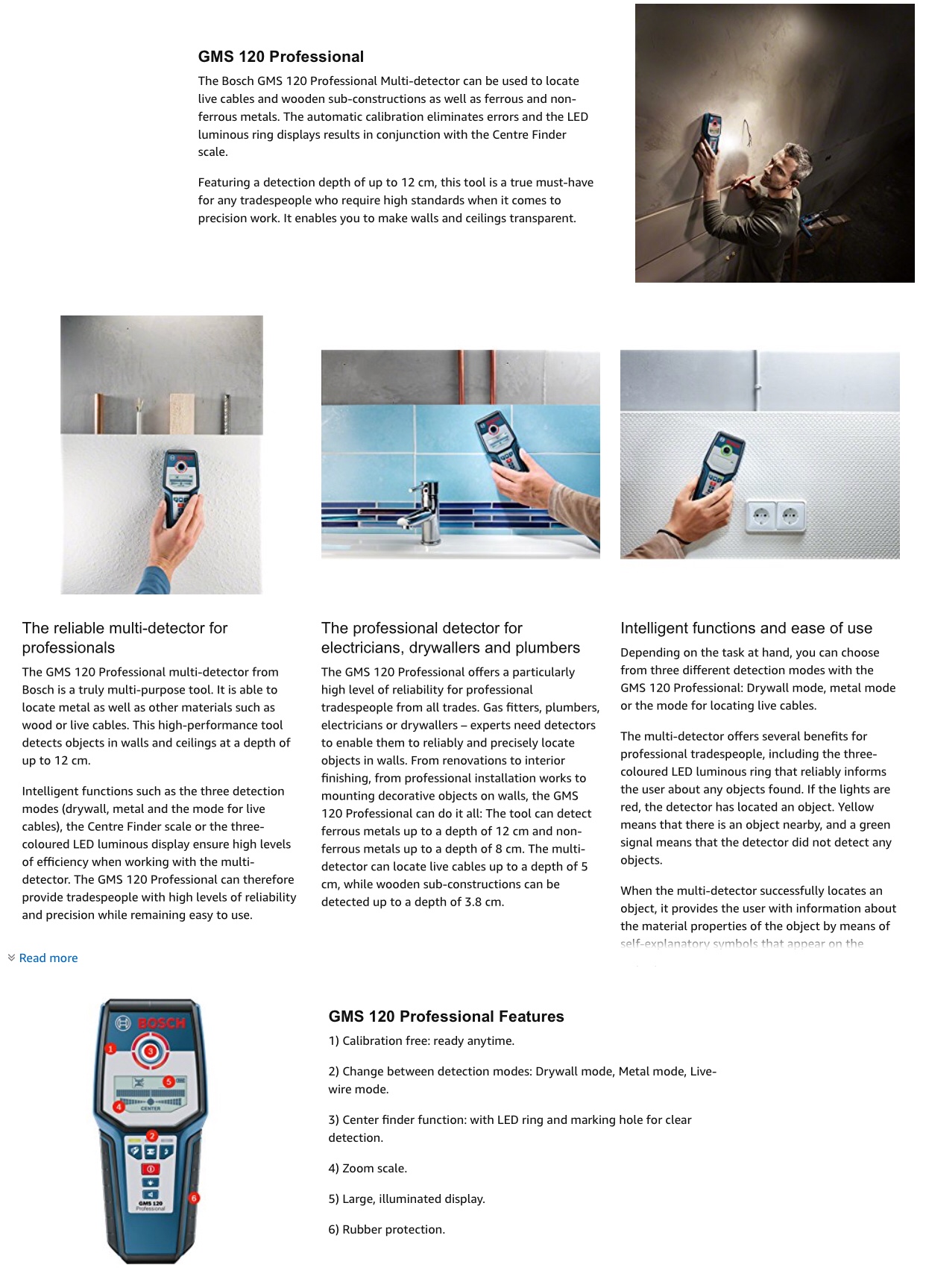 • Maximum reliability: Most objects are found and application errors are avoided due to the automatic calibration • Reliable detection even of deep-lying objects – up to a depth of 12 cm • Even more reliable detection of objects due to three-colour LED luminous ring • Pinpoint indication of the object's centre with the Centre Finder scale and display of material properties • Helpful visibility of the result due to illuminated display • Detectable materials are Ferrous metals, non-ferrous metals, wooden studs, live cables • Max. detection depth: 120 mm, steel: 120 mm, copper: 80 mm, live cables: 50 mm, wooden substructures: 38 mm