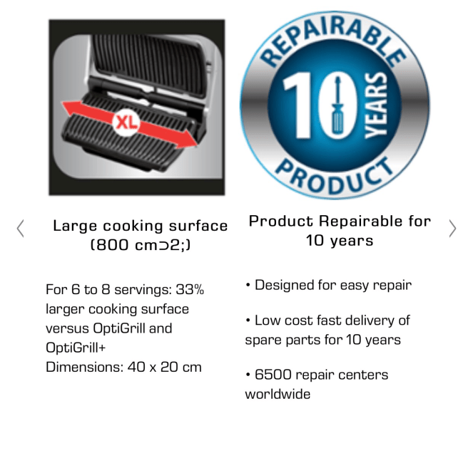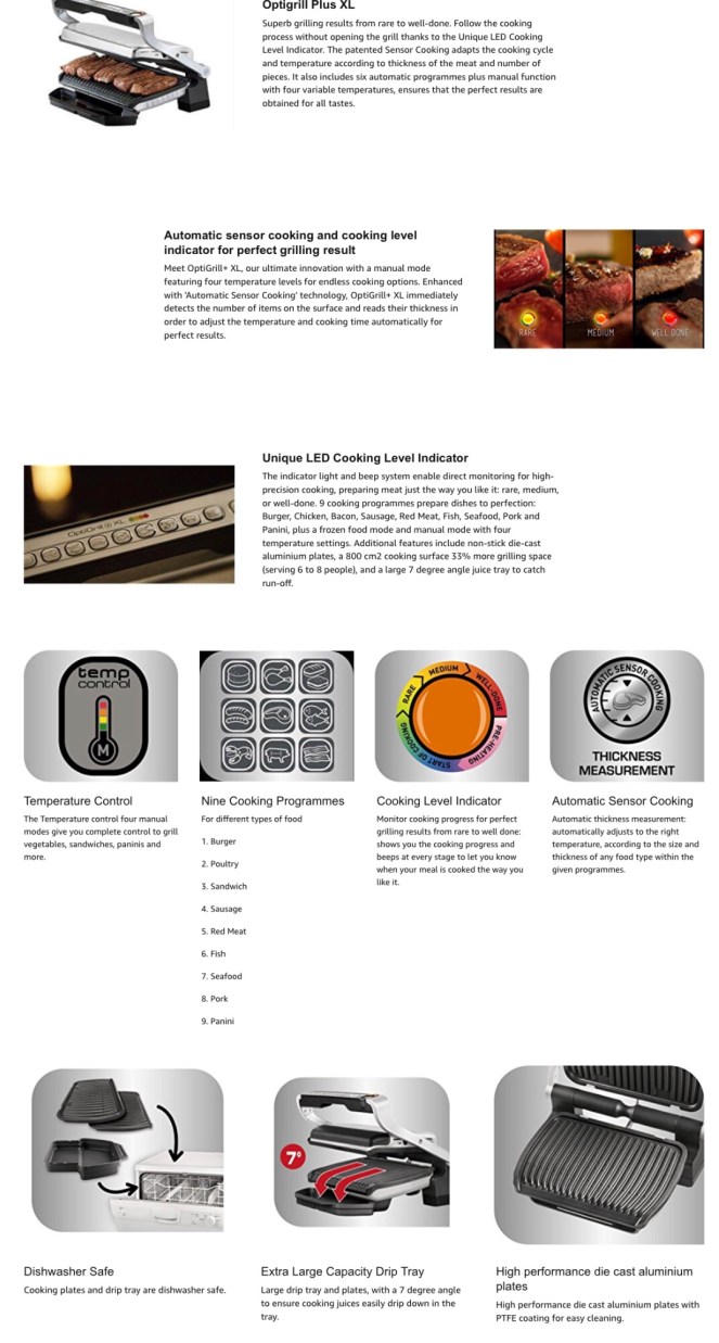 • Effective grilling results from rare to well-done; automatic thickness measurement adapts the cooking for efficient results• LED cooking level indicator accurately indicates the level of cooking from rare to well-done; 800 sq. cm cooking surface, with 33% more grilling space (capacity for six to eight people)• Nine automatic cooking programmes (burger, red meat, sandwich, sausage, fish, poultry, seafood, bacon and pork), which automatically adapt the temperate to each type of food to cook it perfectly• Manual control, featuring four adjustable temperature settings to cook all sorts of food, including frozen foods• Removable, non-stick plates and drip tray are dishwasher safe, for fuss-free cleaning