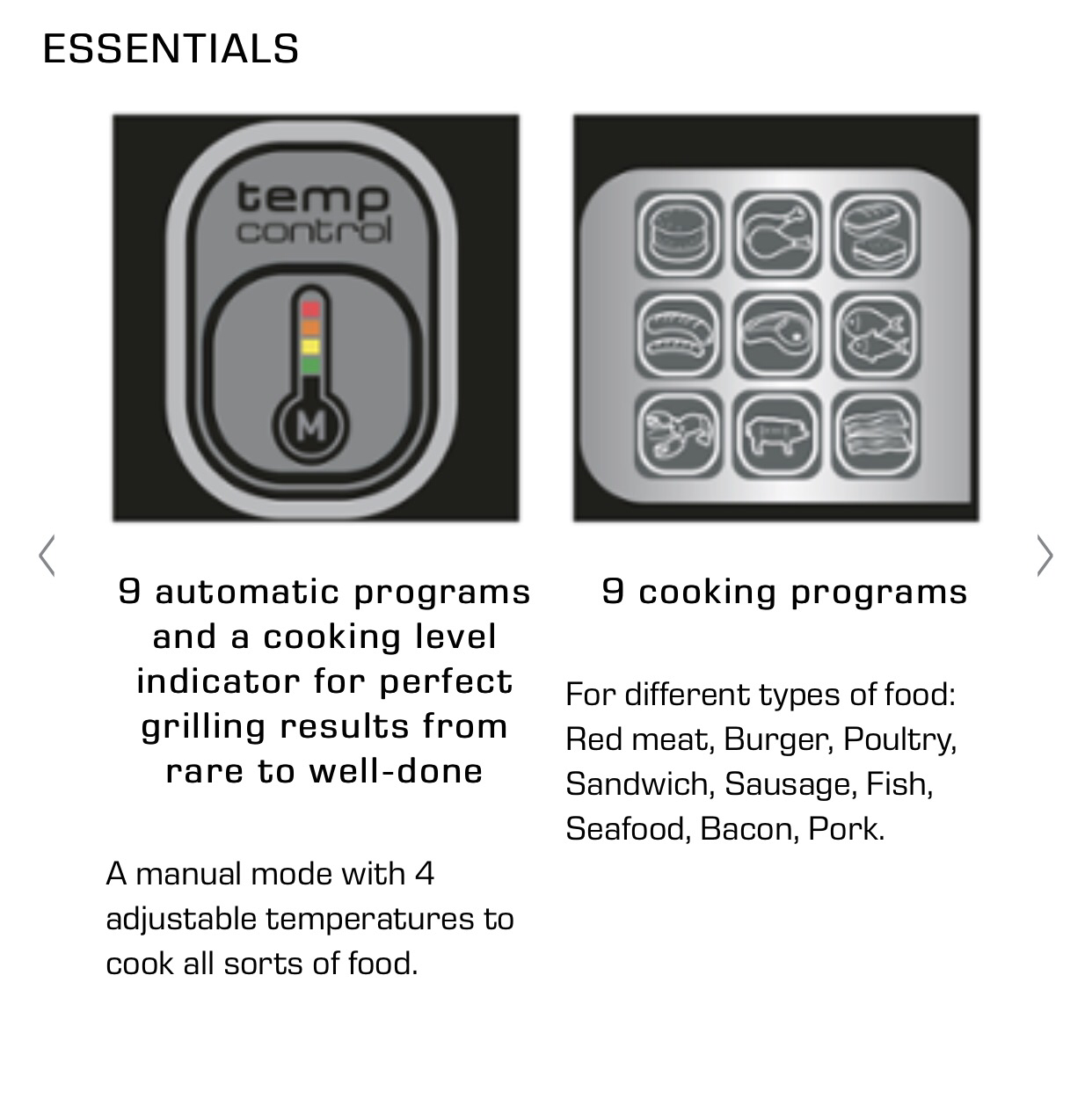 • Effective grilling results from rare to well-done; automatic thickness measurement adapts the cooking for efficient results• LED cooking level indicator accurately indicates the level of cooking from rare to well-done; 800 sq. cm cooking surface, with 33% more grilling space (capacity for six to eight people)• Nine automatic cooking programmes (burger, red meat, sandwich, sausage, fish, poultry, seafood, bacon and pork), which automatically adapt the temperate to each type of food to cook it perfectly• Manual control, featuring four adjustable temperature settings to cook all sorts of food, including frozen foods• Removable, non-stick plates and drip tray are dishwasher safe, for fuss-free cleaning