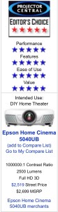 In the end this is a highly unique set of features that exists nowhere else in this price range. The only other models under $3,000 that have both 4K-enhancement and powered Lens Memory are the Epson 5040UBe, which is a wireless version of the 5040UB, and the Epson Pro 4040. Due to outstanding performance and an impressive array of features, ProjectorCentral is pleased to give the Epson Home Cinema 5040UB our top honor, the Editor's Choice Award.