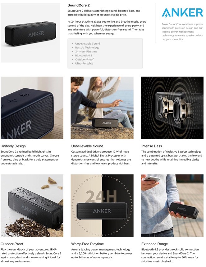• What You Get: Anker SoundCore 2 Bluetooth speaker, Micro USB charging cable, welcome guide, our worry-free 18-month warranty and friendly customer service.