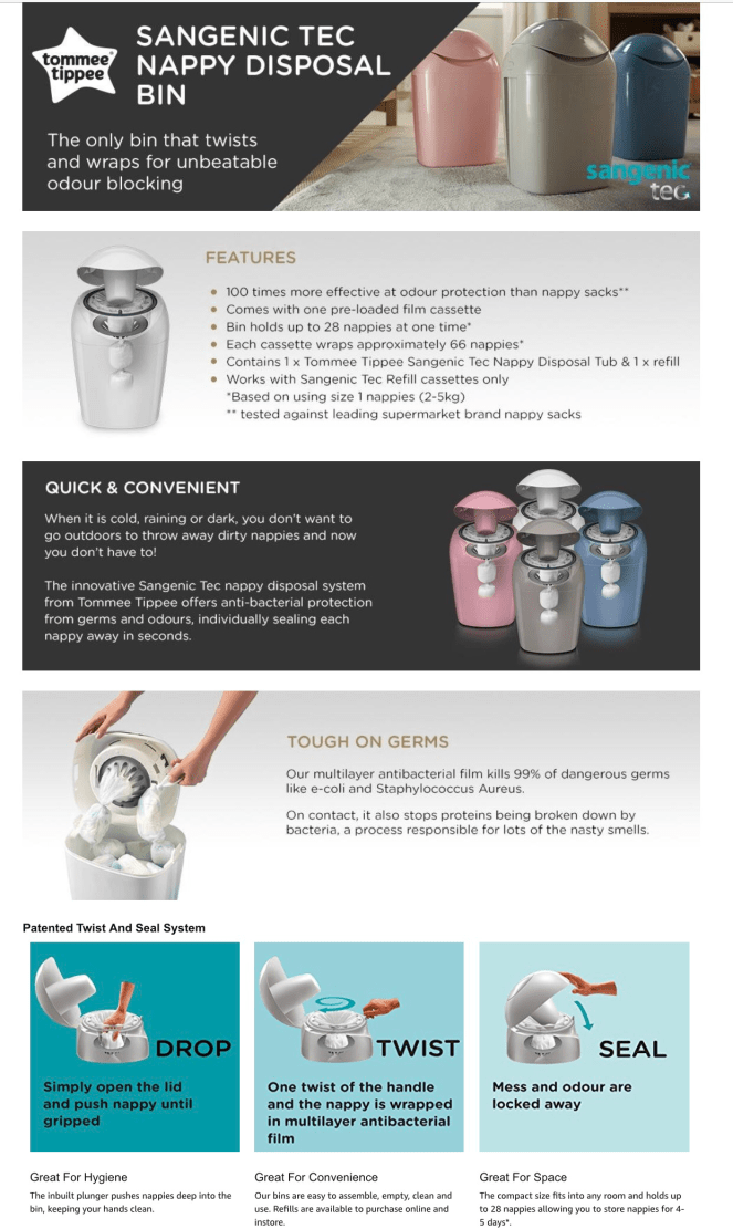 - Contains 1 x Tommee Tippee Sangenic Tec Nappy Disposal Tub and 1 x Pre-loaded Sangenic Tec Refill Cassette