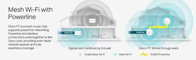 Deco P7 is a mesh router that supports powerline networking. Powerline and wireless connections work together to link Deco units, providing even faster network speeds and truly seamless coverage.