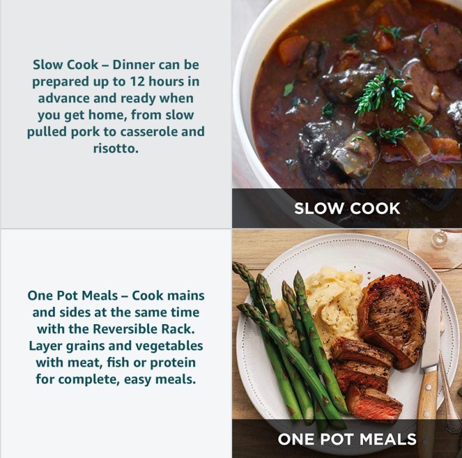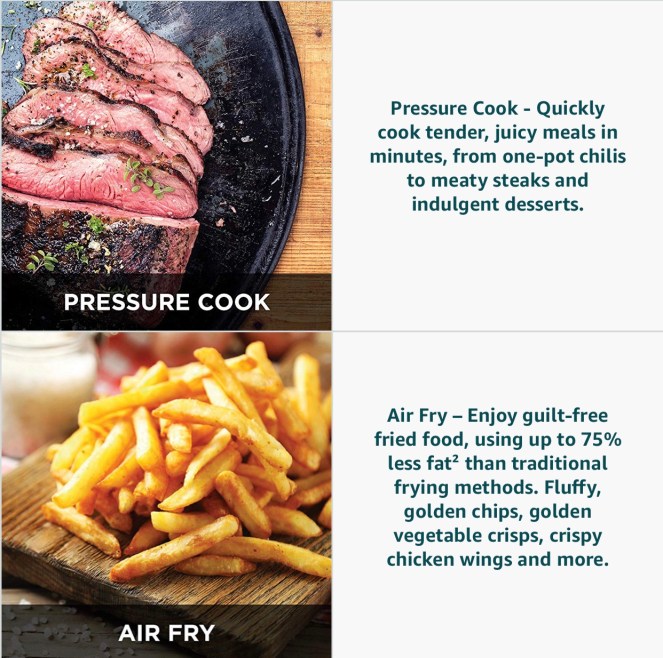 - • Multiple cooking functions – pressure cook, air fry, slow cook, steam, sear/sauté, bake/roast and grill