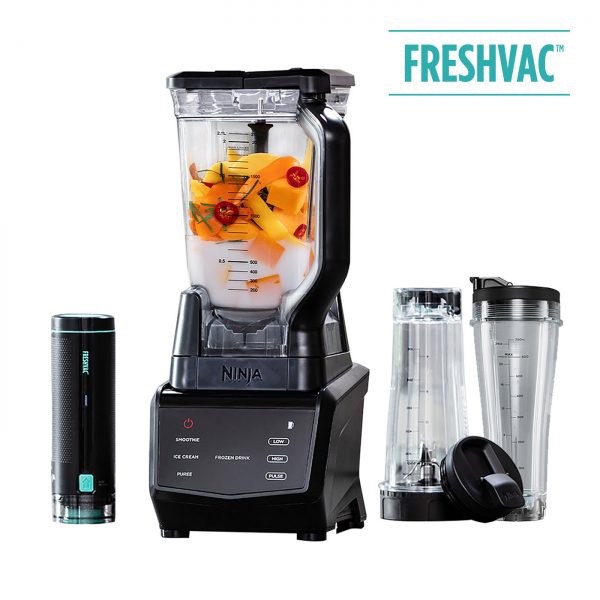 - Includes 2.1 Litre blending jug and total crushing blades, 2 x 600 ml Ninja cups and PRO extractor blades, two x spout lids, vacuum pump