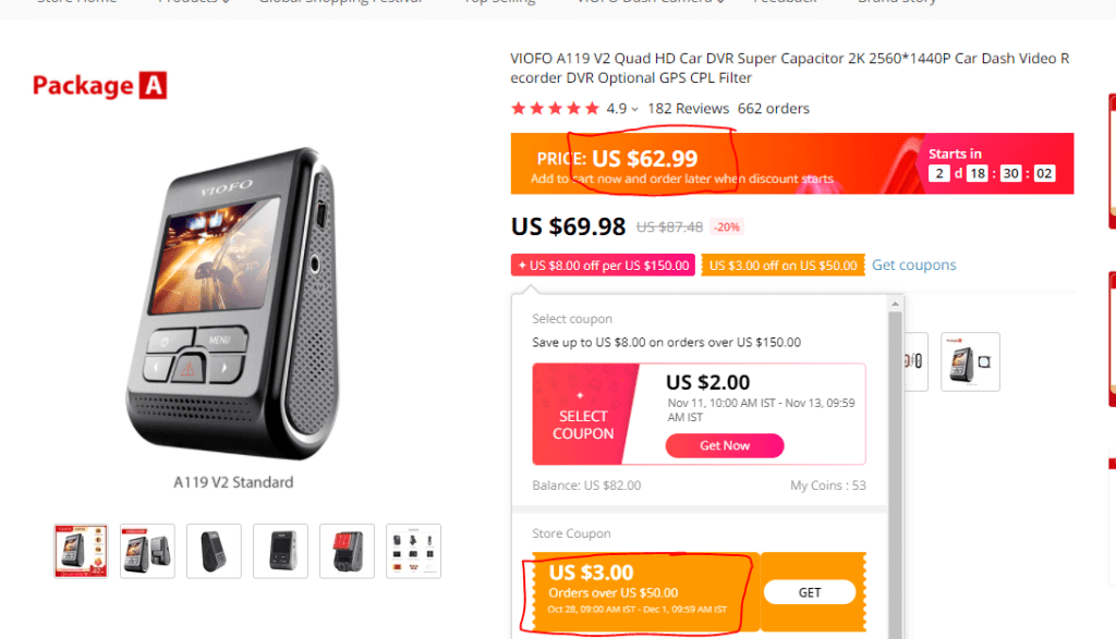 לדוגמה נוספת קופון מוכר, מה אנחנו רואים פה? המוצר יעלה ביום הרווקים 62.99$ בנוסף יש לנו קופון של המוכר שצריך לאסוף לפני 3$ בקניה מעל 50$ ויש לנו קופון נוסף שנוכל להכניס 7$ מעל 50$ כלומר מחיר סופי של המוצר יהיה