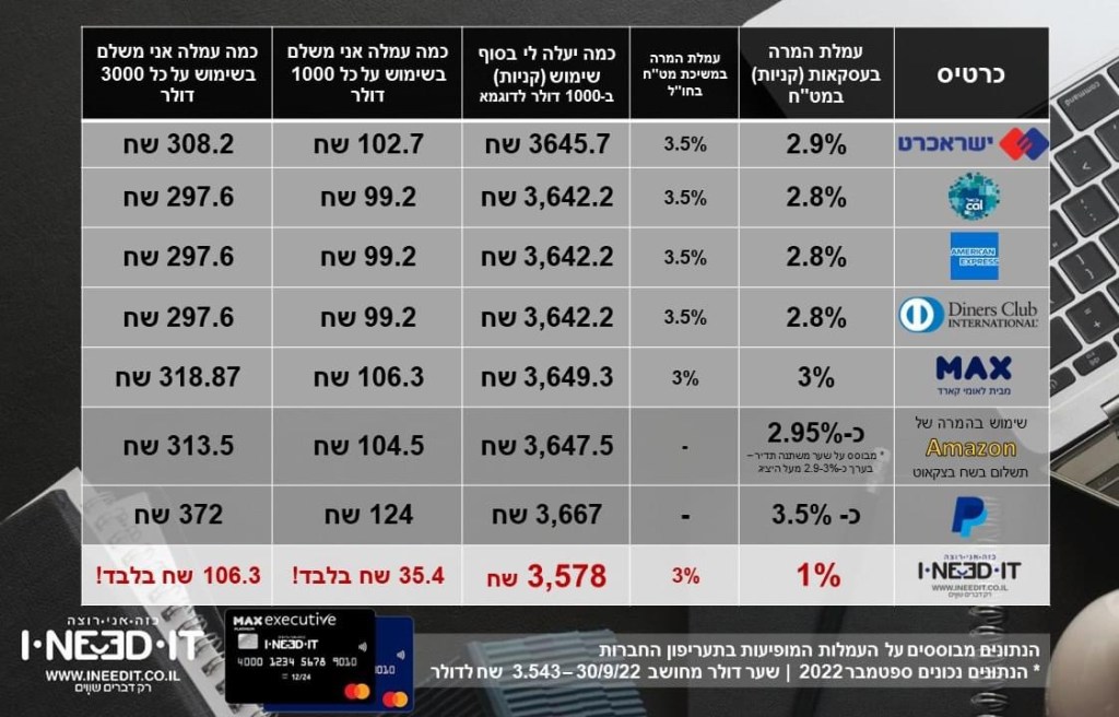 וזיכרו – כרטיס האשראי שיעניק לכם עמלת המרה נמוכה של 1% בלבד (חסכון אדיר של מאות שח לשנה), ללא דמי כרטיס ועוד שלל הטבות – לפרטים מלאים, רישום וקבלה בחינם (לכל החיים!) – https://www.max.co.il/cards/card/2867