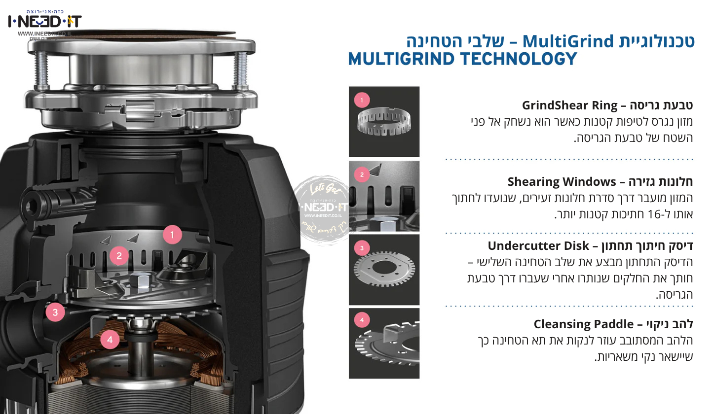 - מנוע חזק ואמין במיוחד, לטחינה מהירה ורציפה של שאריות מזון קשות במיוחד.