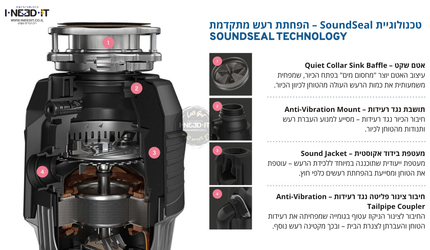מאפשרת פירוק יעיל של שאריות מזון, כולל עצמות, קליפות קשות ושאריות סיביות, עם טחינה דקה במיוחד למניעת סתימות. - פעולה שקטה במיוחד SoundSeal – בידוד רעשים מתקדם שהופך אותו לאחד הטוחנים השקטים בעולם.