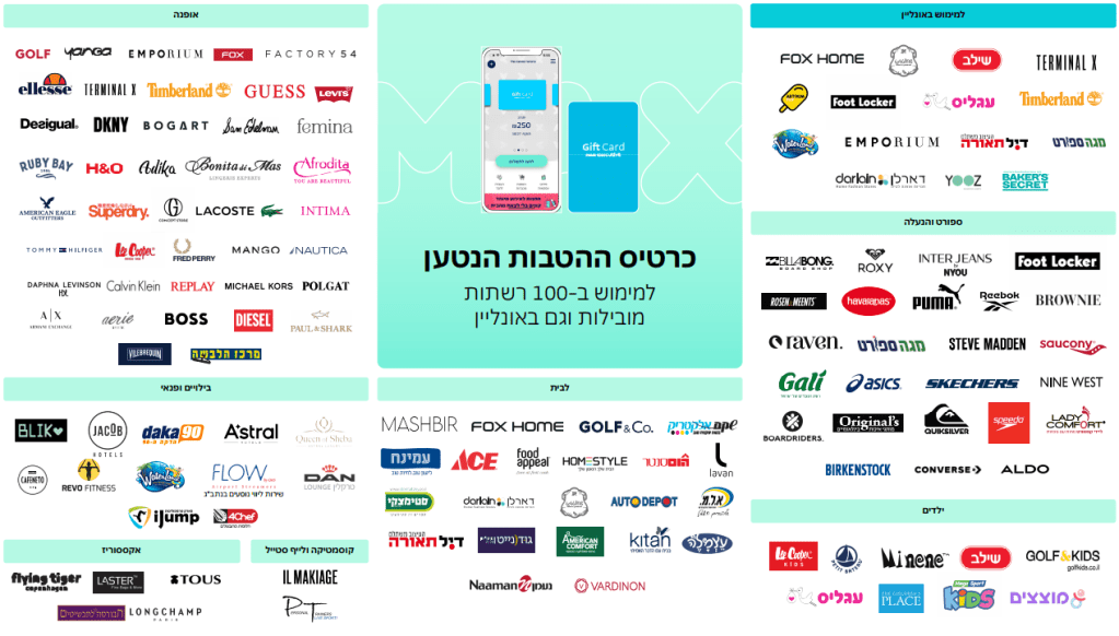 הכרטיס הדיגיטלי של Max מאפשר לכם ליהנות מגמישות מלאה ולהשתמש בו בקלות אונליין או בחנויות הפיזיות, במגוון רחב של תחומים: אופנה, ספורט, ילדים, חשמל, פנאי, טיפוח, בילויים ועוד.